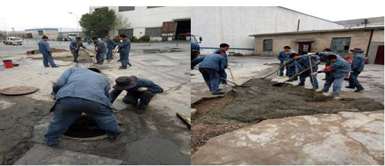 時(shí)至夏日,天氣多變。臨時(shí)土建維修隊(duì)充分發(fā)揮車間人員中懂得土建施工技能的優(yōu)勢(shì),悉心謀劃,從職工家中借用攪拌機(jī)等施工機(jī)械,加班加點(diǎn)有序進(jìn)行著屋面防水修復(fù)、路面地基處理、排水溝的修復(fù)等維修工作。在公司車隊(duì)密切配合下,截至6月4日共修復(fù)屋面防水358平方米,路面維修290平方米、路基整修87立方米,排水溝修復(fù)15米,生產(chǎn)廠區(qū)道路破裂,瀝青澆灌等各項(xiàng)工作。