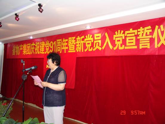 我宣誓:"我志愿加入中國(guó)共產(chǎn)黨,擁護(hù)黨的綱領(lǐng),遵守黨的章程,履行黨員義務(wù),執(zhí)行黨的決定,嚴(yán)守黨的紀(jì)律,保守黨的秘密,對(duì)黨忠誠(chéng),積極工作,為共產(chǎn)主義奮斗終身,隨時(shí)準(zhǔn)備為黨和人民犧牲一切,永不叛黨"。6月29日上午10∶00時(shí),17名新加入黨組織的中國(guó)共產(chǎn)黨預(yù)備黨員、所屬各黨組織書記、老黨員代表等30余人的莊嚴(yán)宣誓,標(biāo)志著青海物產(chǎn)系統(tǒng)慶祝建黨91周年系列活動(dòng)正式展開。